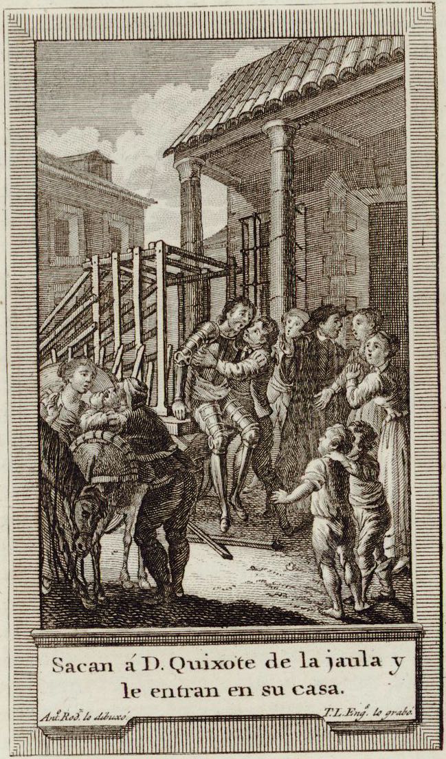 Sacan á D. Quixote de la jaula y le entran en su casa