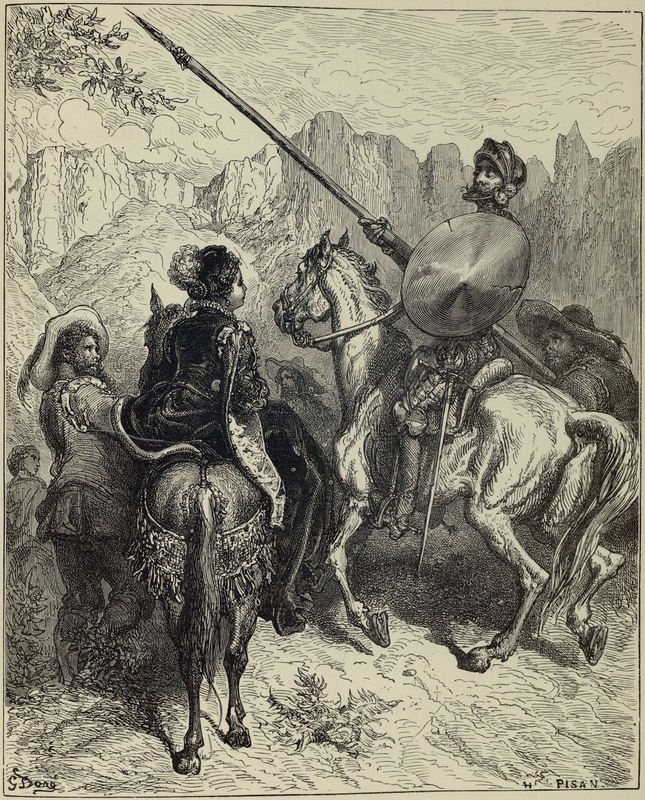 Don Quixote, princess Mimicona (Dorotea), Cardenio, Sancho Panza, the priest, and the barber prepare to leave Sierra Morena. Signed by G. Doré (illustrator) and H.-J. Pisan (engraver). Part 1, ch. 29.