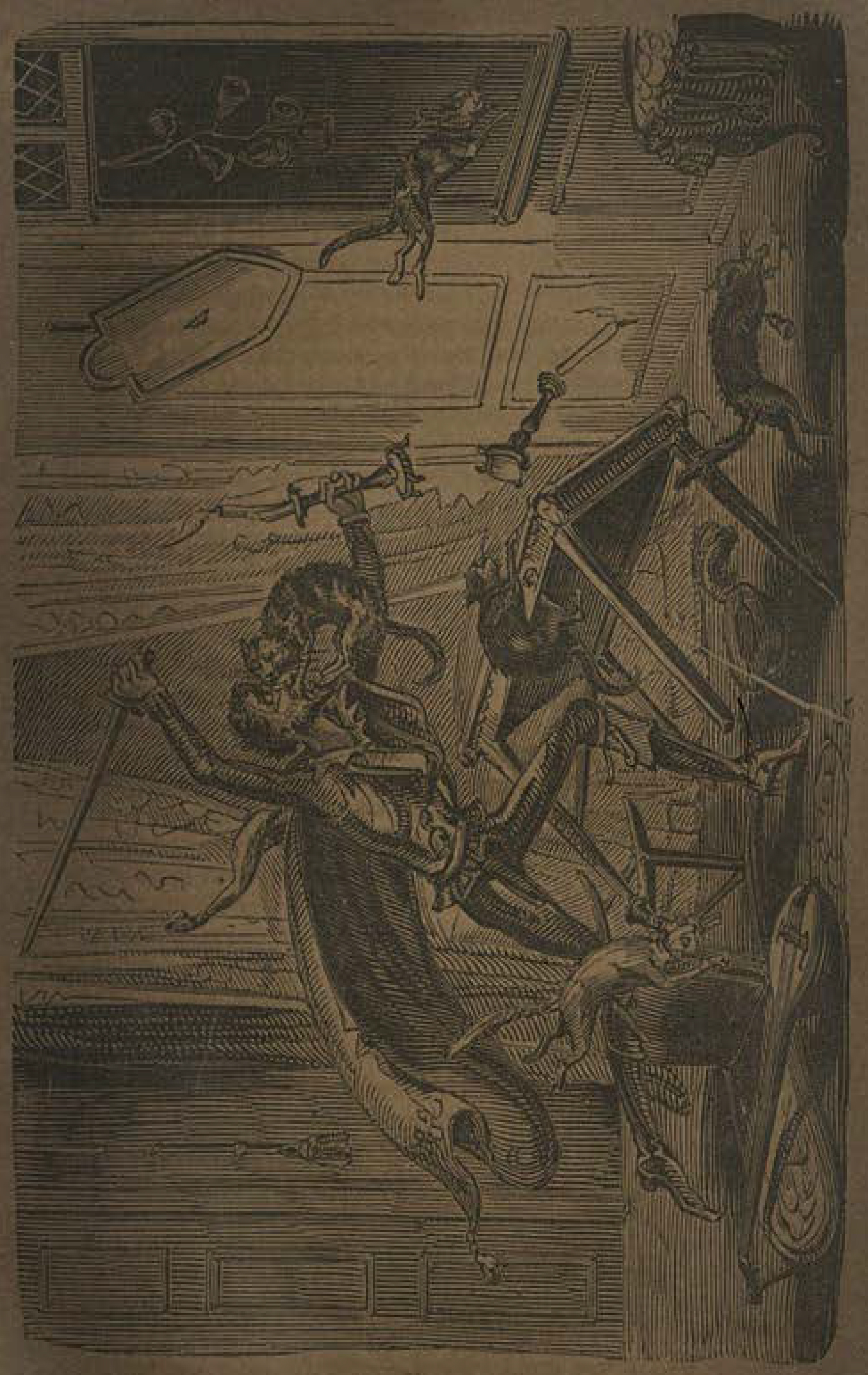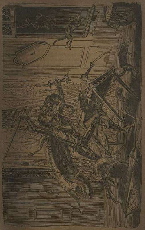 Five cats, released from a bag, find their way into Quixote's room and scramble about. The knight-errant slashes wildly with his sword in his right hand thinking the cats to be invading necromancers; in his left hand Quixote holds a lighted candle, knocking over a table in assault. One cat attaches itself to his nose and scratches his face. On the right, a cat jumps out the window where a hanging row of bells jingle. Next to the window, Quixote's shield hangs askew.