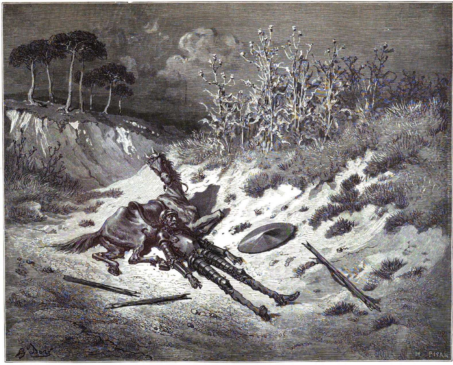 Don Quixote lies wounded from his beating from the muleteer. Unable to think of a method used by the knights in his stories to cure himself, he sings an old song from the tale of Baldwin and the Marquis of Mantua, the same song which Baldwin is supposed to have sung while lying wounded in the forest. Don Quixote lies propped up against Rocinante, his broke lance at his feet. This scene can be found in Part I, Book 1, Chapter 5.
