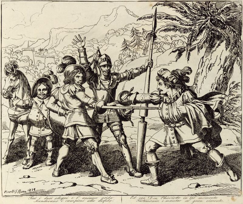 In the foreground, Don Quixote judges a fencing duel between Corchuelo and another student. Also pictured is Sancho Panza (left). Signed by Bartolomeo Pinelli (engraver and illustrator) and dated Rome, 1833. Plate 46. Part 2, ch. 19.