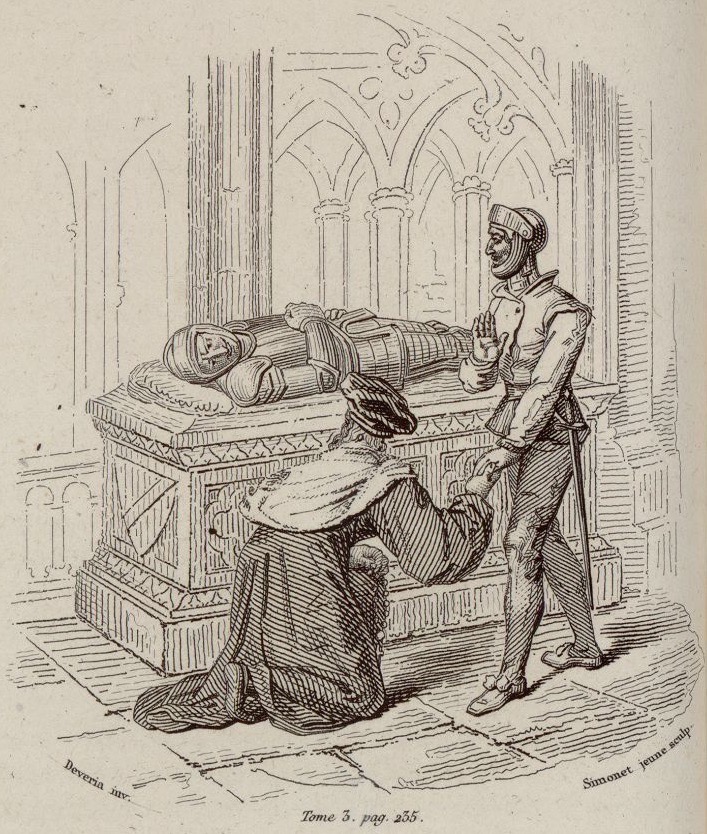 Montesinos kneels before Don Quixote at Durandarte’s tomb. The knight describes this scene when telling the story of his adventure in Montesinos’ cave. Signed by A J.-J.-M. Devéria (illustrator) and A. J. Simonet, jeune (engraver). Part 2, ch. 23.
