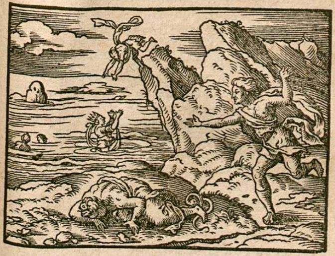 This engraving illustrates Aesacus, a son of King Priam of Troy, chasing a nymph named Hesperie. Aesacus fell madly in love with Hesperie and often pursued her. During one of his pursuits of the nymph, Hesperie fell prey to a snake hiding in tall grass. The bite from the snake was fatal and killed her. The illustration shows Hesperie on the ground with the snake by her ankles and Aesacus running after her. Blaming himself for her death, Aesacus threw himself from a cliff which is depicted in the background of the engraving. The sea-goddess, Thetis, pitied Aesacus and transformed him into a loon just before he hit the water. Thetis is visible in the water in the background of the engraving with her hands pointing up towards Aesacus as he falls.
