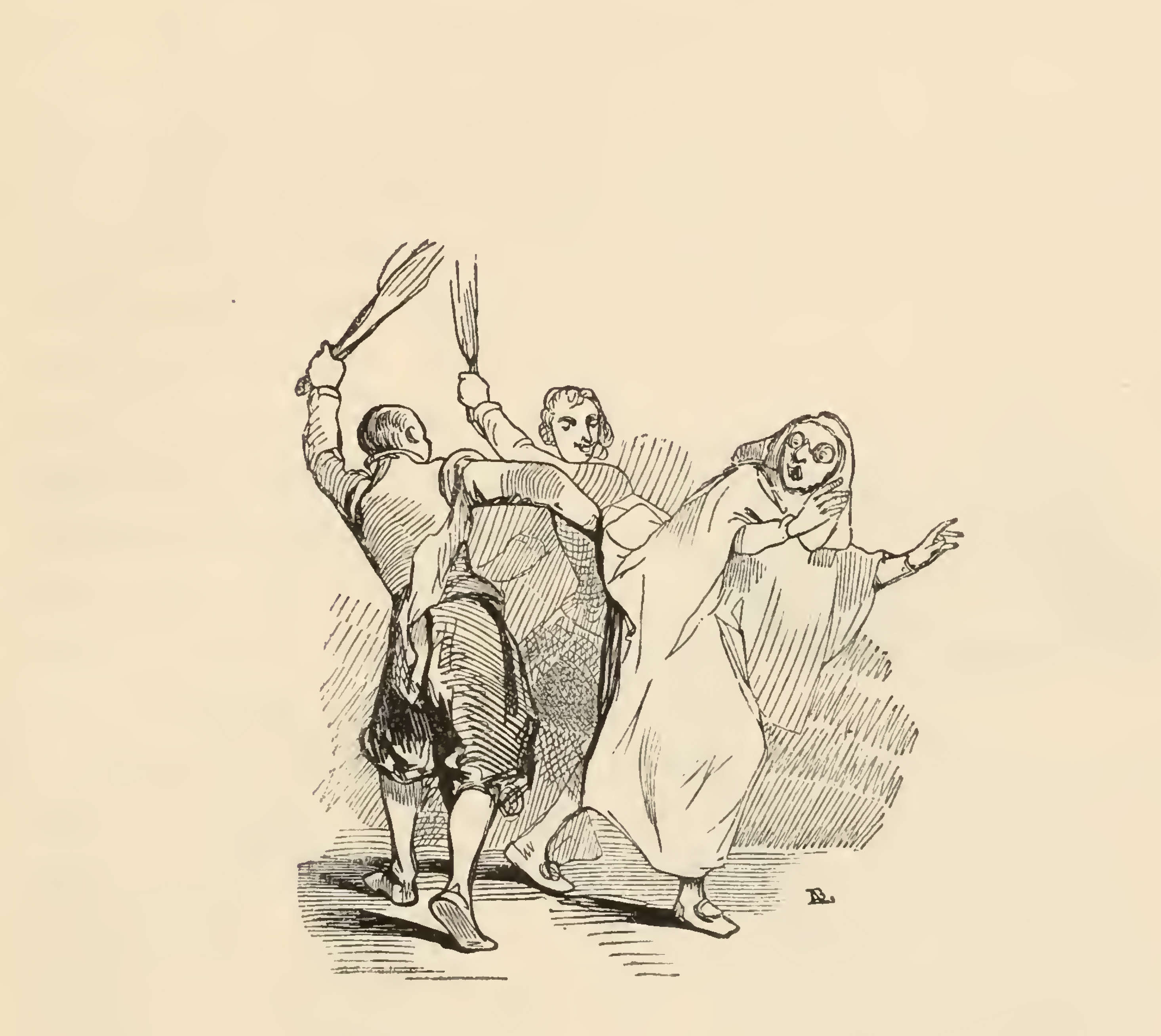 Two men stand in a dark room with a thick bundle of hay in their left hands, poised to flog an elderly woman on the right in the white habit and spectacles. The two notable faces in the image are the man in the middle who appears to be smiling and the woman on the right who opens her mouth out of fear.