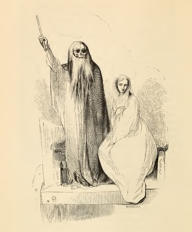 Pictured on the right on an elevated throne upon a drawn cart sits a young woman clad in a veil of silver tissues. To her right stands a figure arrayed in a gown of state, which reaches his feet, his face is that of a skeleton's, without flesh and skin. This living Death lifts his right hand which holds an ivory rod that he takes for a wand, and speaks with heavy words to Don Quixote (not pictured).