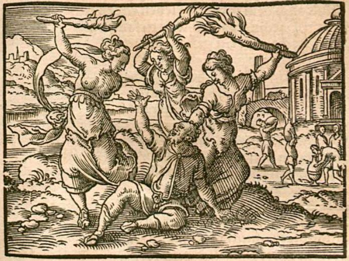 This engraving illustrates the Bacchantes, frenzied women who worship the god Bacchus, seconds away from ripping Pentheus apart. Pentheus, the prince of Thebes, disrespected Bacchus by not believing in him and did not want to participate in the festival held in his honour. Pentheus’ punishment for his hubris was to be murdered by his own mother and two aunts. The woman in the engraving who is holding onto Pentheus’ head is his mother, Agave, who will rip his head off his body. The other two women are his aunts Ino and Autonoë, who will rip his arms off. The city in the background represents the city of Thebes.