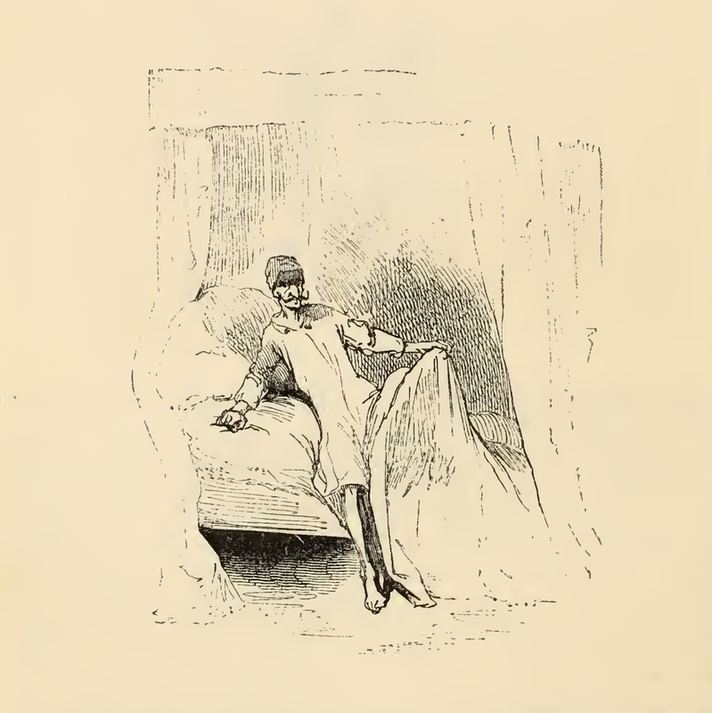 Having listened to Altisidora's song by the windowsill, Don Quixote clad in an extra large loose white shirt that falls to his knees and a greasy cap upon his head, steps into a bed. Quixote is pictured midway through entering the covers, his right foot planted on the ground and his left foot beneath a thin white blanket.
