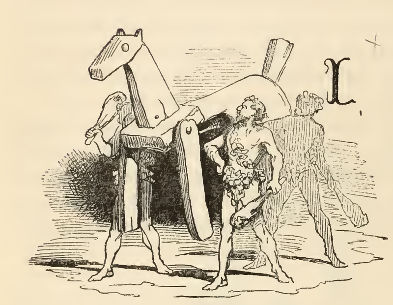 Four men enter a garden, all clad in green ivy, equipped with clubs and bearing on their shoulders a large wooden horse. The image is occasioned by the countess Trifaldi calling for Clavileno the allegedly flying wooden horse.