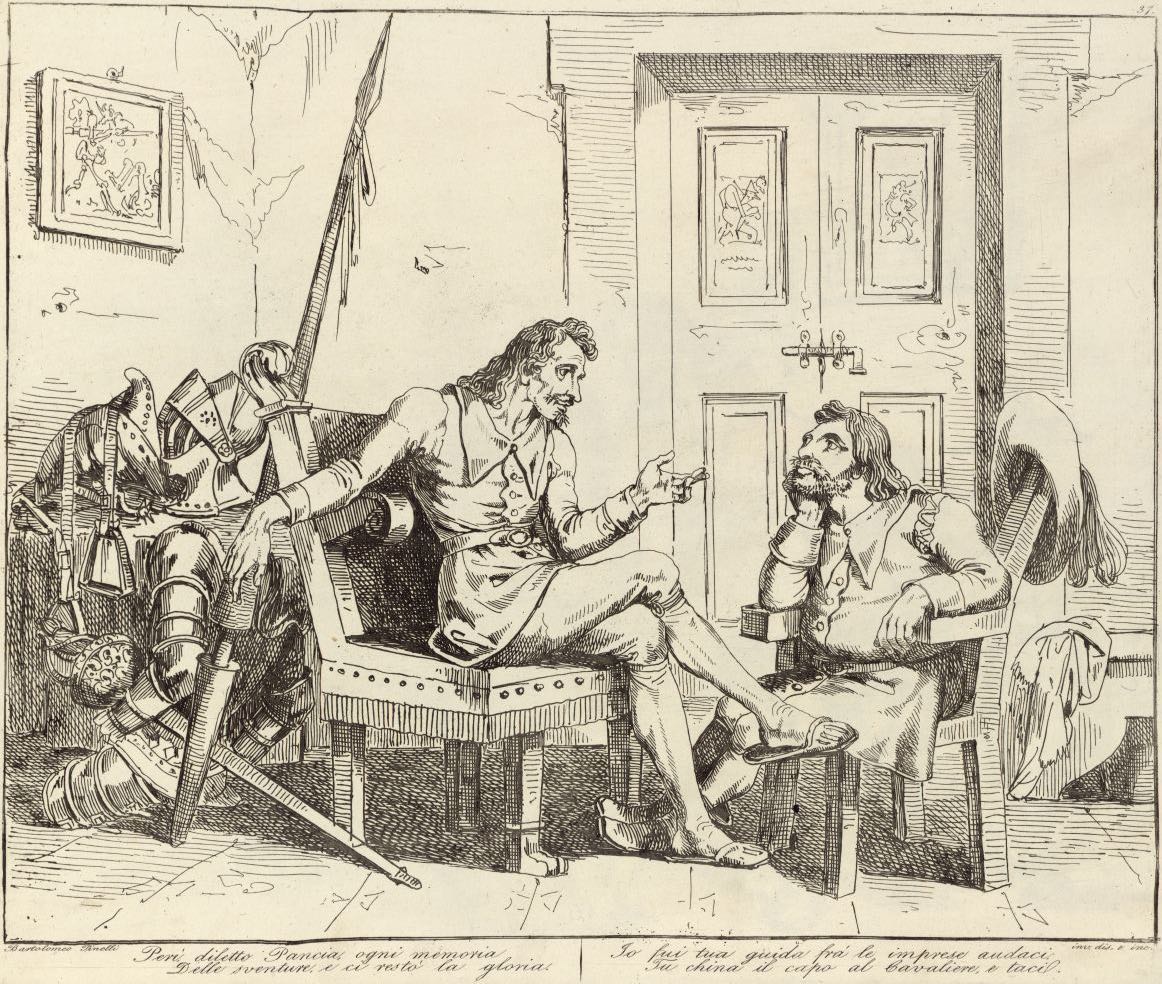 Seated in Don Quixote’s house, the knight and Sancho Panza discuss and reminisce about the first part of their adventures. Don Quixote’s armour, lance, and sword are depicted on a table in the room. Signed by Bartolomeo Pinelli (engraver and illustrator) and dated Rome, 1833. Plate 37. Part 2, ch. 2.