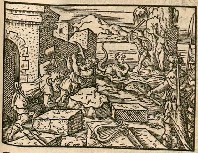 This engraving illustrates the gods Apollo and Neptune in human form on the left side of the engraving with tools in their hands. There are big stones at their feet as they help build the walls of the soon-to-be city, Troy. The trident of Neptune and the lyre of Apollo are resting on the stones beside them. There is a man illustrated in the foreground on the right side of the engraving facing the two gods. This is King Laomedon, who had promised Apollo and Neptune a sum of gold in return for their help to build the walls of Troy. King Laomedon, however, does not keep his word and fails to provide the gods with their payment. Upset by this, Neptune causes a great flood which destroys the country’s crops. To further the punishment, Neptune orders that King Laomedon’s daughter, Hesione, will be tied to a rock and fed to a sea-monster. Hesione is illustrated in the background of the engraving, tied to the rock whilst being rescued by Hercules.
