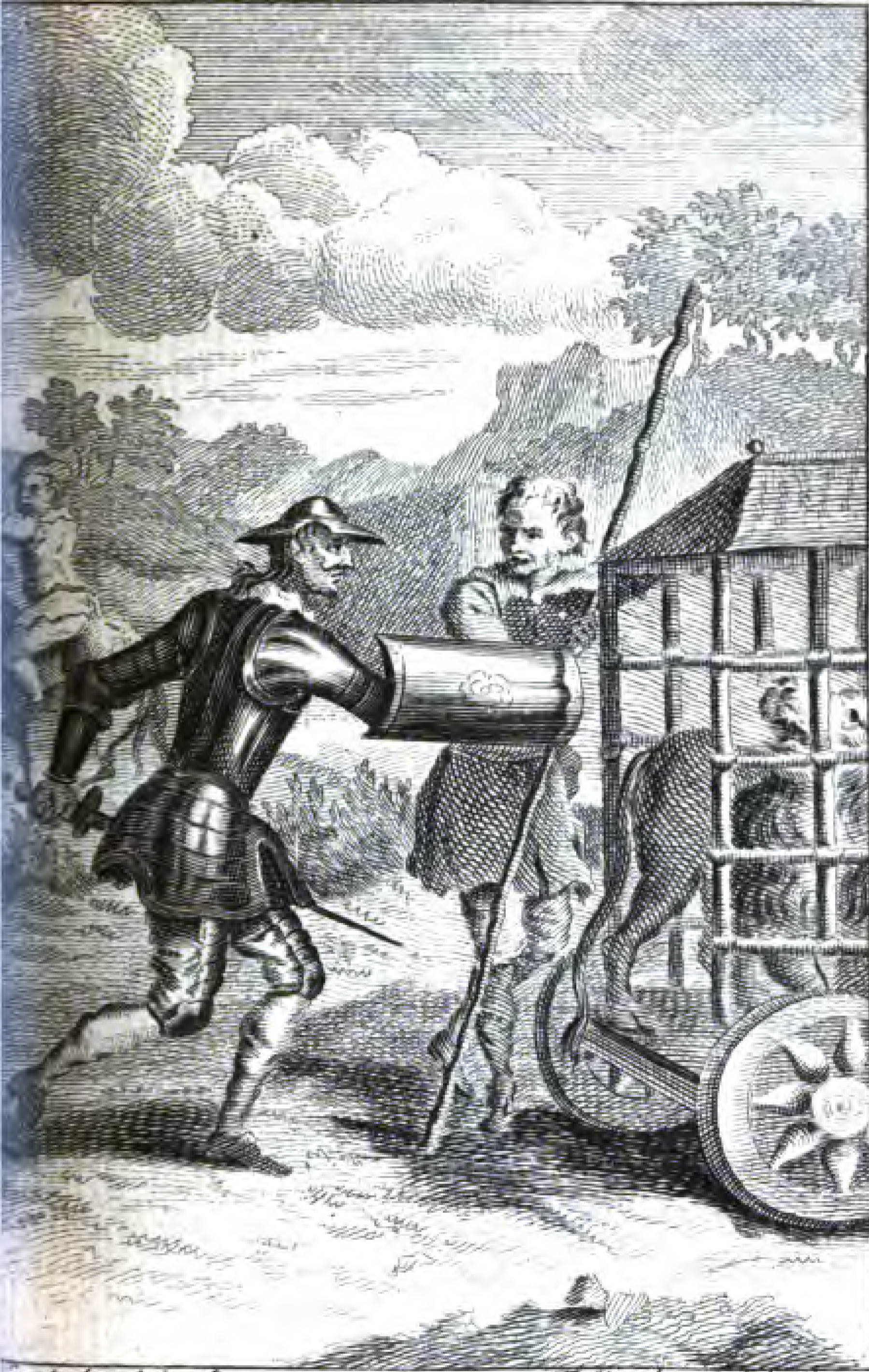 Don Quixote and Sancho Panza encounter a cart with flags led by mules and a man sitting upon the forepart. Don QuixoteQ halts the cart and asks what the cart's purpose is and what it holds within it. The carter answers that the cart is his own and he's keeping two fierce hungry lions within the cart which he's bringing to the king as a gift from the General of Oran. Sensing an opportunity to test his bravery, Quixote intimidates the lion keeper into opening the lion's cage so he may slay the beast. Fearing that Don Quixote will do him harm, the keeper (right) assents and opens up the cage while Sancho Panza (background left) flees from the scene, lamenting the death of his master from afar. Once the cage is opened, Don Quixote observes the lion on foot with sword and shield in hand ready to do battle with the lion. The lion shows no interest in Don Quixote nor his bravado and turns his posterior to the knight-errant before lying down in the cage once more.