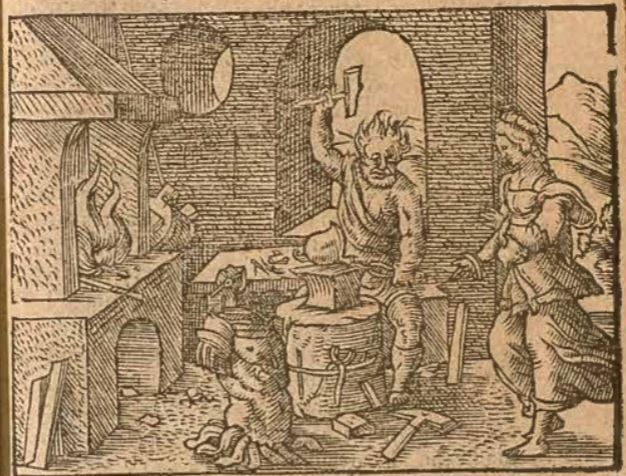 Thetis, the mother of Achilles, is depicted standing on the right side of the engraving as she approaches the blacksmith god, Vulcan. Thetis sought out Vulcan as she wanted him to forge special weapons and armour for Achilles to protect him in war. Vulcan is depicted forging a helmet as he sits at his workstation. There is a cuirass that had already been forged resting on the ground in front of Vulcan.