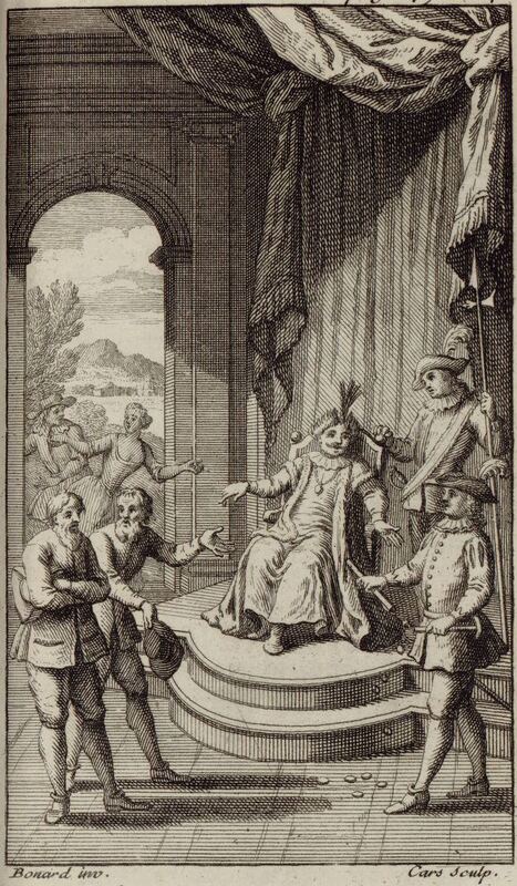 Sancho Panza, governor of Barataria Island, orders that a staff be broken, spilling the coins that were hidden inside. The plaintiff and the defendant stand to the left, while in the background a man and a woman wait for the next judgement. Signed by Bonard (illustrator), no given name, and L. Cars (engraver). Part 2, ch. 45.
