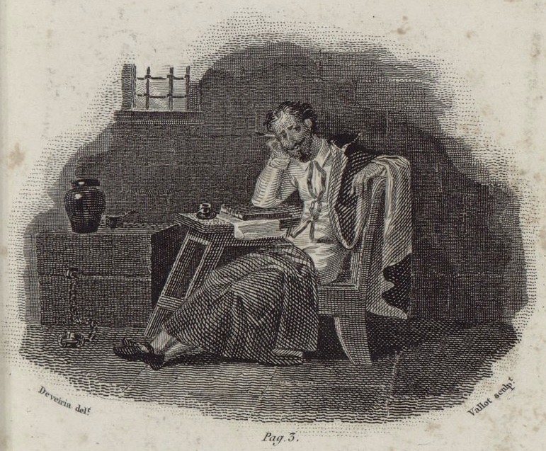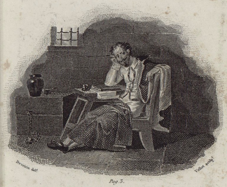 - Miguel de Cervantes Saavedra, imprisoned and writing Don Quixote’s story. Signed by A J.-J.-M. Devéria (illustrator) and P. J. A. Vallot (engraver). Prologue.