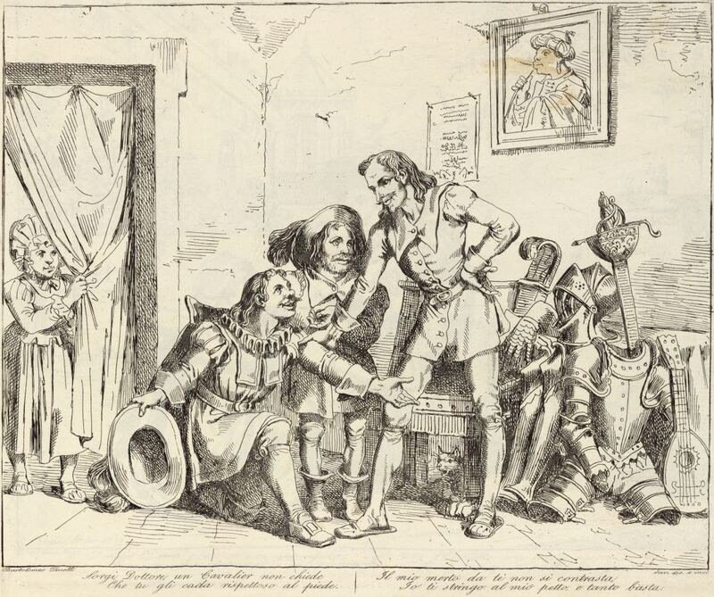 Sansón Carrasco arrives at Don Quixote’s house and kneels before the knight. He has come to tell Don Quixote and Sancho Panza about the publication of the story of the first part of their adventures. Signed by Bartolomeo Pinelli (engraver and illustrator) and dated Rome, 1833. Plate 38. Part 2, ch. 3.
