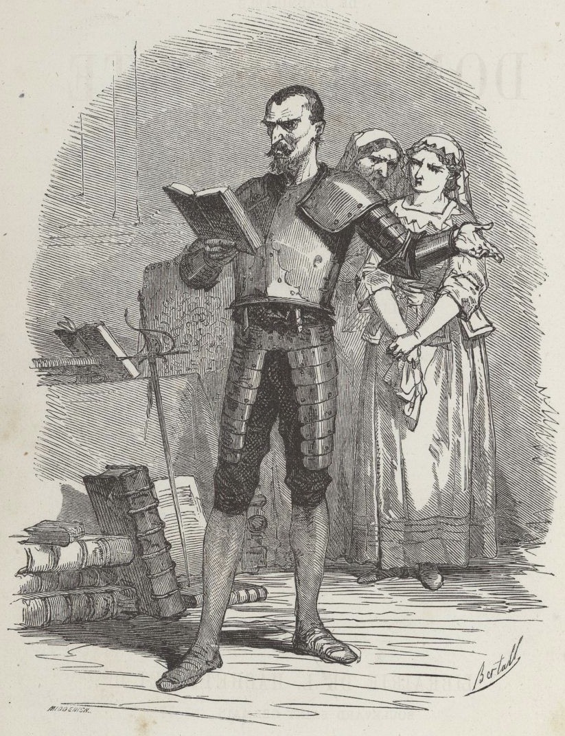 - Don Quixote, wearing his armour, reads chivalric books in his library. The niece and the housekeeper (background) watch him, concerned. Signed by A. d’Arnoux (illustrator) and Midderigh (engraver). Part 1, ch. 1.
