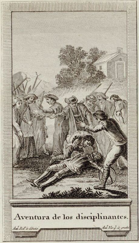 Sancho Panza tends to Don Quixote after he was beaten by one of the penitents. Surrounding them are the canon of Toledo, the priest, the barber, the officers of the Holy Brotherhood, and the penitents with their pointed hoods. Signed by A. Rodríguez (illustrator) and B. Vázquez (engraver). Part 1, ch. 52.