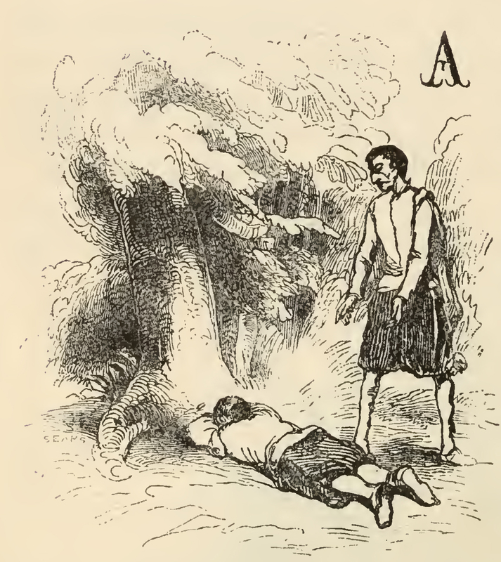 Having slept in the forest next to the town where Quiteria was to be wed, Don Quixote calls to his squire to wake, his hands lifted before his knees as he tries to wake Sancho with his voice. Sancho, for his part, lies with his face to the roots of a tree, his legs spread out behind him, sound asleep.