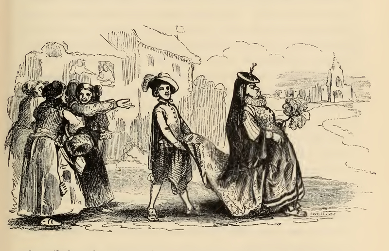 An older woman (right) walks in the direction of a church located in the background on the right. She is wearing a courtly petticoat, regal hat, and holds a distaff in her left hand. She is followed by a male attendant who carries the back end of her dress so it does not drag along the dirt, he is also wearing regal attire and a plumed hat. On the left, a group of women have gathered in farmer's clothing with baskets in hand, pointing and gesturing to the countess as if to mock her. In the background on the left, the silhouette of people pointing at the countess can be seen from the windows of buildings. The image is occasioned by Teresa Panza saying "No, I would not have people, when they see me decked out like a countess or governess, immediately say : ' Look how stately madam hog-feeder moves ! Yesterday she toiled at her distaff from morning to night, and went to mass with the tail of her petticoat over her head instead of a veil, and to-day, forsooth, she goes with her farthingale, her embroideries, and her nose in the air, as if we did not know her'" (Page 59).