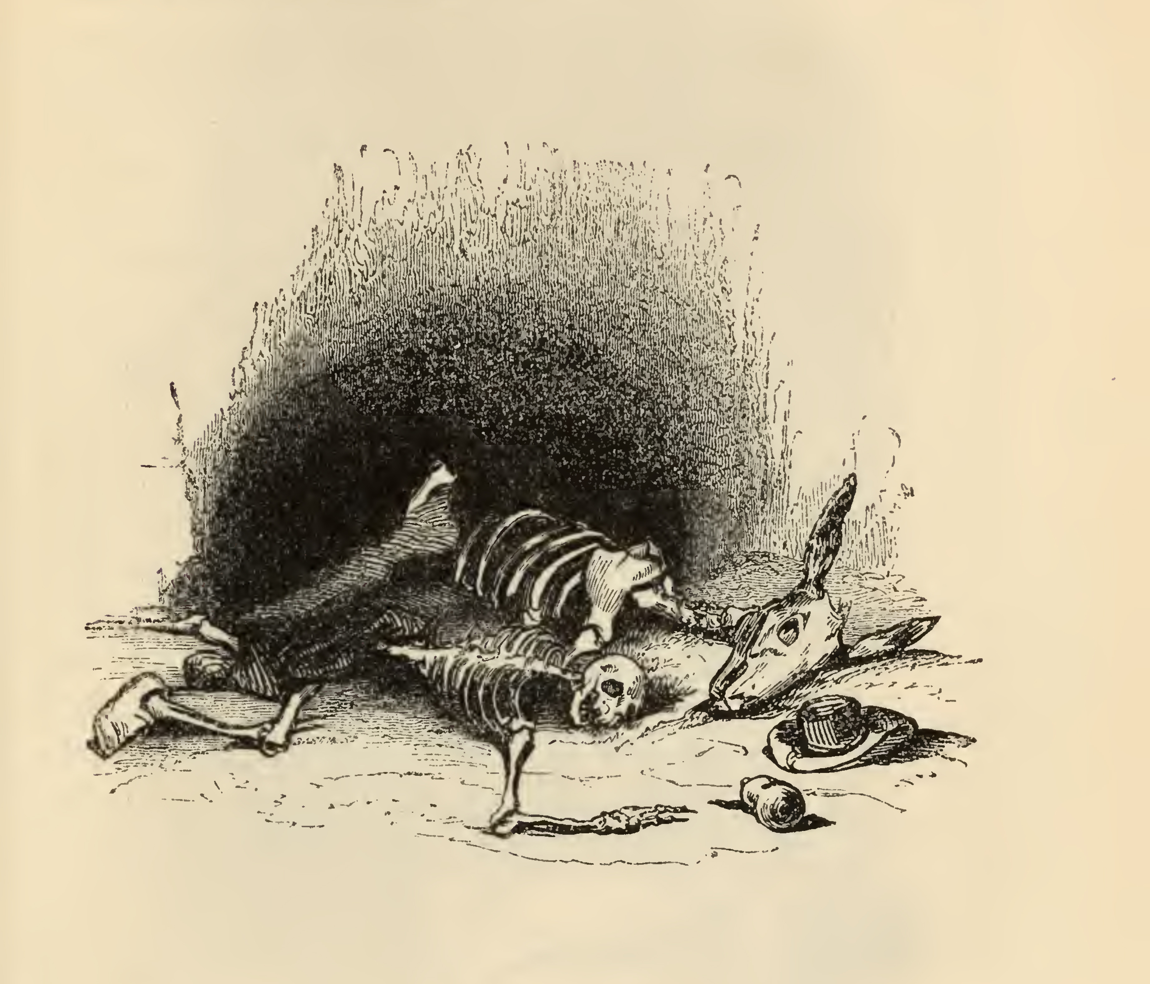 Two skeletons lie prostrate upon the ground in the darkness. The skeleton in the foreground is human and lying on its front, wearing nothing but a pair of shoes. In the background lies a donkey's skeleton with its ears still attached. On the right sits a pile of folded clothes and a drinking vessel. The image is occasioned by Sancho Panza saying "Hence shall my bones be taken up, when it shall please God that I am found, clean, white, and bare, and with them those of my trusty Dapple, whence perhaps it will be conjectured who we were, at least by those who have been informed that Sancho Panza never parted from his ass, nor his ass from Sancho Panza" (Page 580).