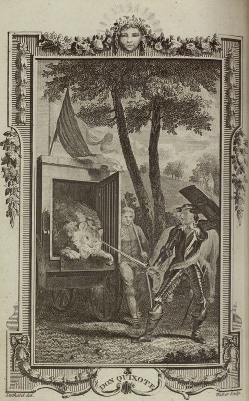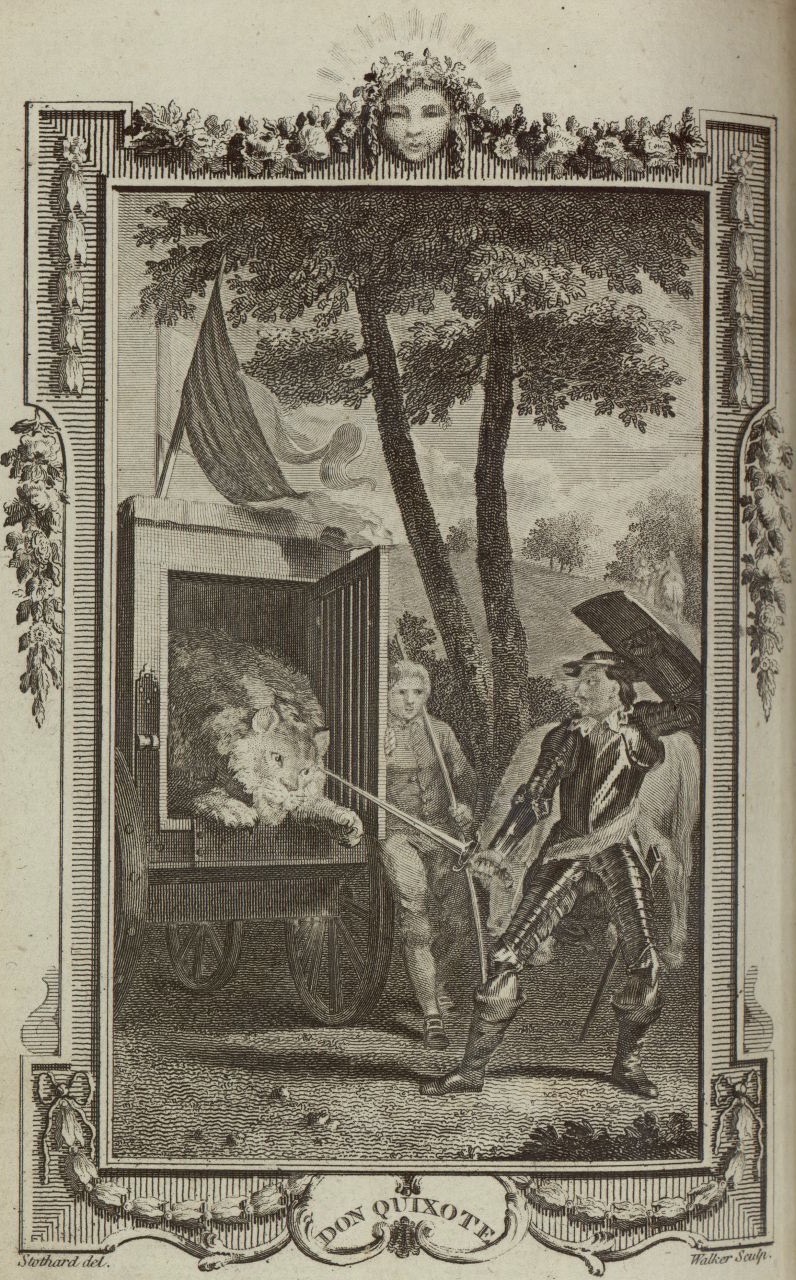 In the background, Sancho Panza runs away (Don Diego de Miranda is not pictured), while in the foreground, Don Quixote prepares to fight the lion as the lion keeper opens the gate. However, the lion refuses to leave its cage. Don Quixote holds his sword in one hand and his buckler in the other. Signed by T. Stothard (illustrator) and Walker (engraver). Plate XIII. Part 2, ch. 17.