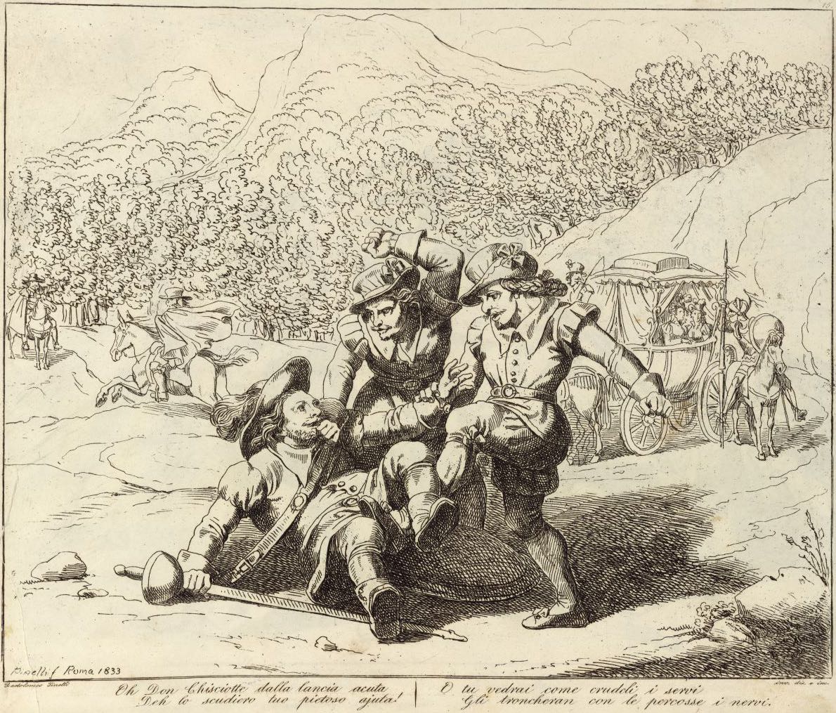 The illustration depicts a scene on the road to Puerto Lápice. In the foreground, the Benedictine friars’ servants beat Sancho Panza. In the background, Don Quixote talks to the ladies in the carriage (right) while the Benedictine friars flee the scene (left). Signed by Bartolomeo Pinelli (engraver and illustrator) and dated Rome, 1833. Plate 15. Part 1, ch. 8.