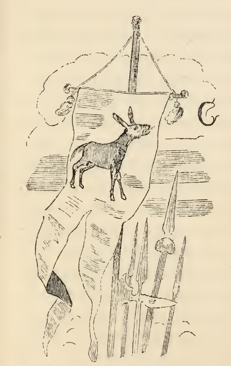 A flag is attached to a wooden stick by rope and string in the fashion of a banner with the depiction of a donkey adorned to its material. Below the flag four spears and a halberd are also carried. The image is occasioned by the holy brotherhood pursuing Gines de Passamonte, the freed slave and infamous who has previously stolen Sancho Panza's donkey, Dapple.