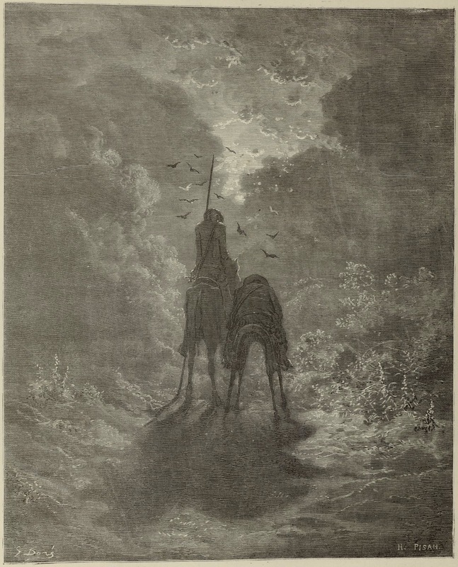 Sancho Panza explains to the bachelor Sansón Carrasco how Ginés de Pasamonte stole his donkey. In the night, Ginés propped up Sancho’s packsaddle on four stakes and left him mounted on them, taking his donkey out from under him. Signed by G. Doré (illustrator) and H.-J. Pisan (engraver). Part 2, ch. 4.