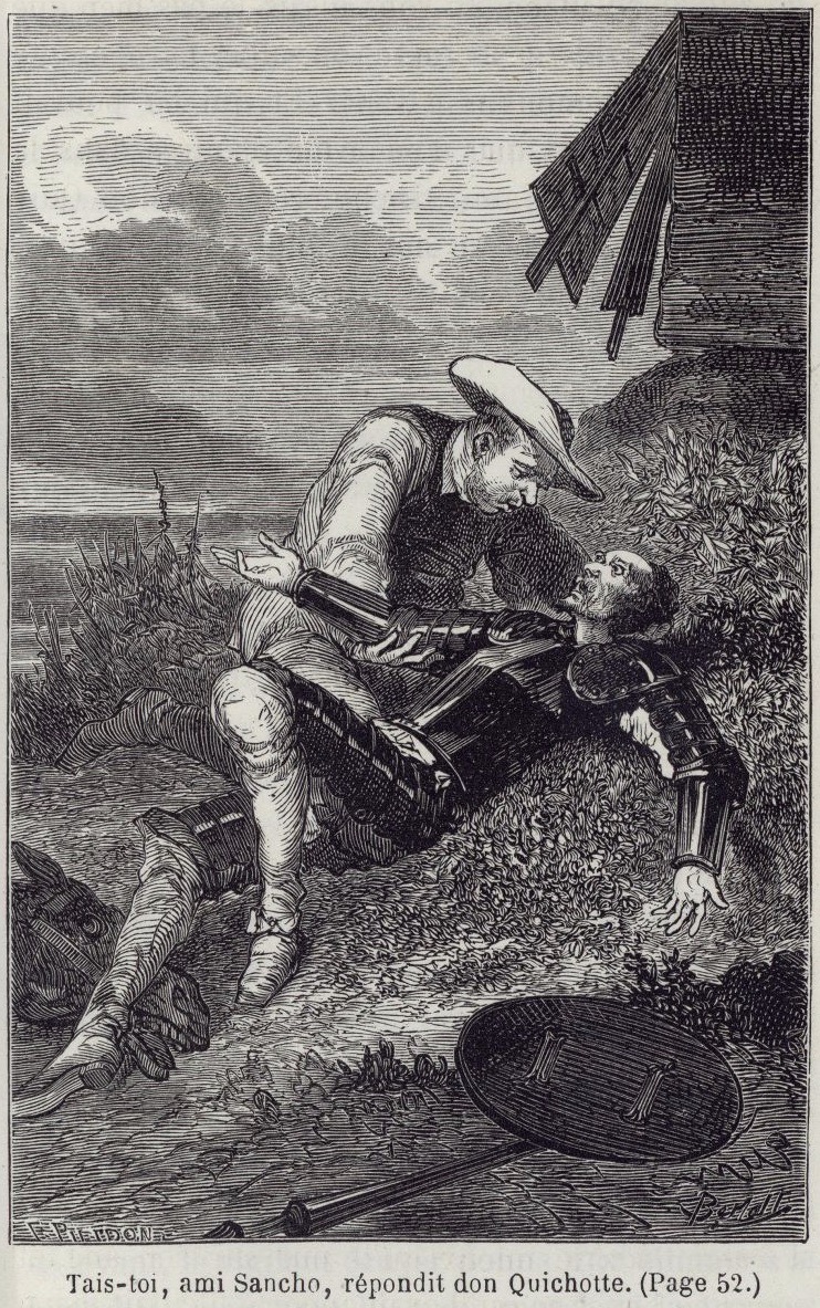 - Sancho Panza helps Don Quixote, who lays defeated by the windmill. Signed by A. ‘Bertall’ d’Arnoux (illustrator) and F. Pierdon (engraver). Part 1, ch. 8.