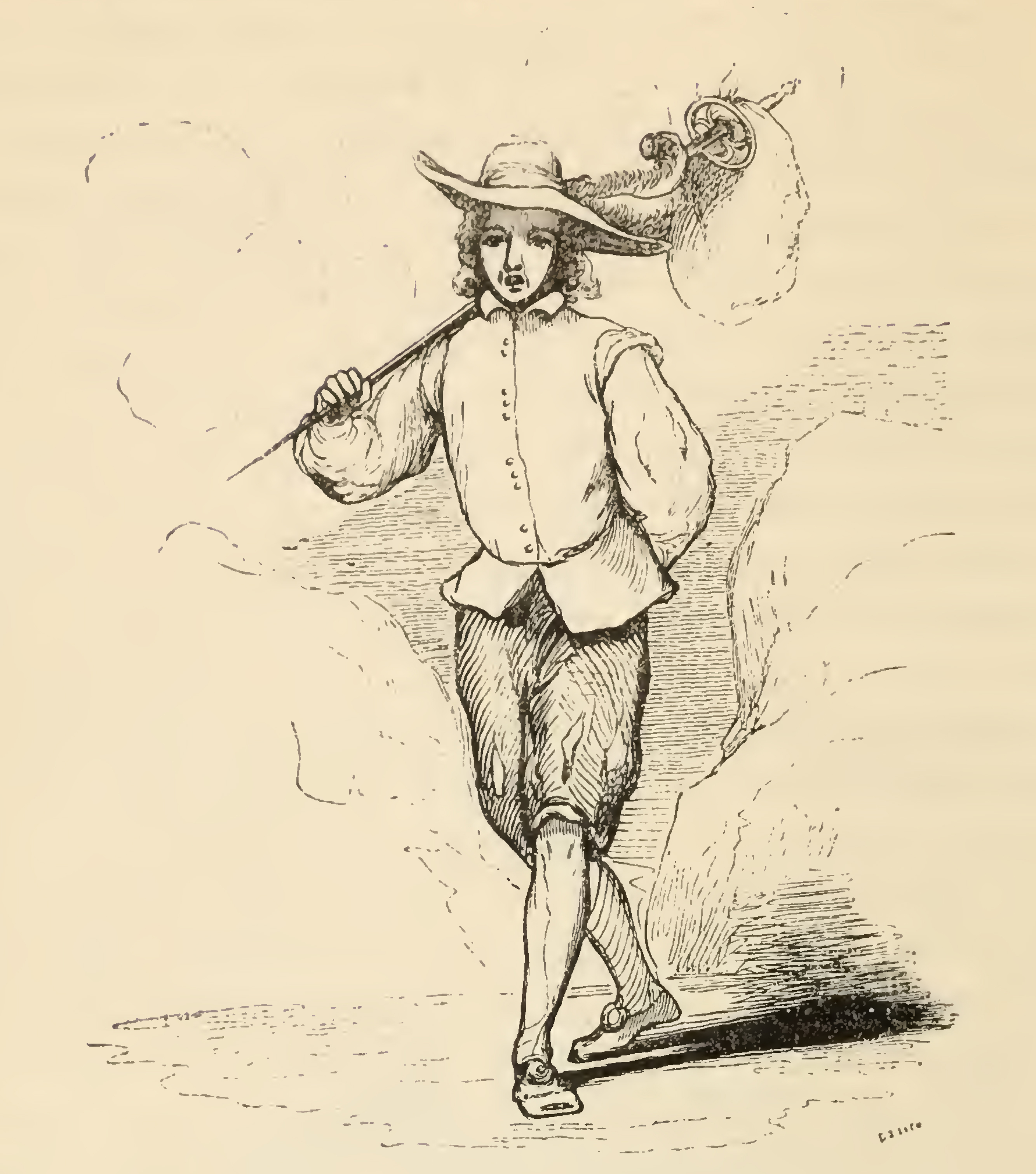 A youth with long curly hair is pictured carrying a sword upon his shoulders, and upon it a bundle of his clothes, such as breeches or his cloak, and a shirt or two. He wears on a velvet jacket lined with satin. His stockings are white, and his shoes square-toed. He faces forward his mouth open.