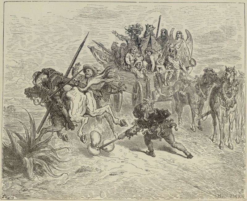 Don Quixote and Sancho Panza encounter a cart carrying the actors of Angulo el Malo’s company for the mystery play ‘The Assembly of Death.’ The latter are dressed as Devil, Cupid, Death, Angel, Emperor, Queen, and Soldier. Rocinante is alarmed by the sound of bells and runs across the field. While Sancho runs to Don Quixote’s assistance, a member of the company makes off with his donkey. Signed by G. Doré (illustrator) and H.-J. Pisan (engraver). Part 2, ch. 11.
