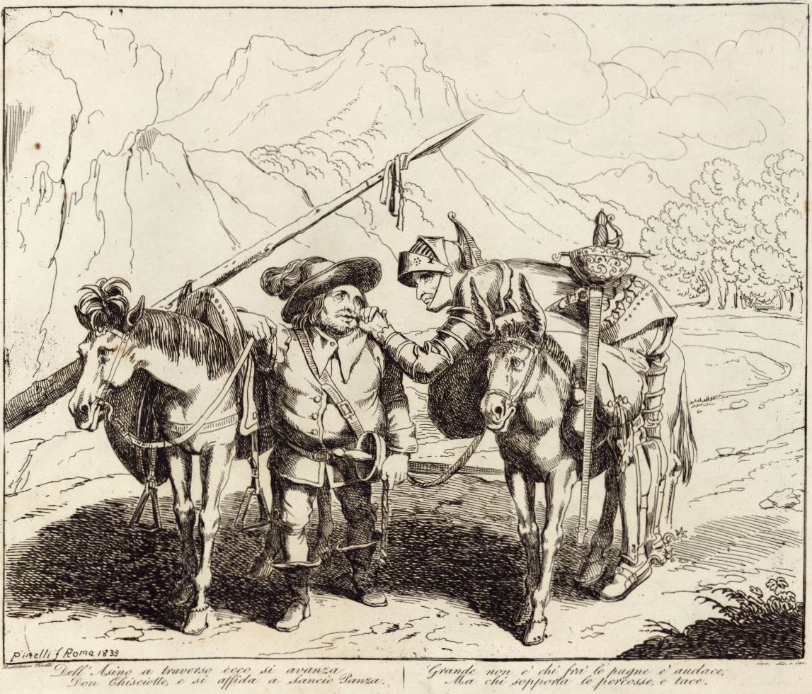 After their encounter with the Yanguesans, Sancho Panza settles Don Quixote on his donkey and leads him and Rocinante by their halters to an inn. Signed by Bartolomeo Pinelli (engraver and illustrator) and dated Rome, 1833. Plate 20. Part 1, ch. 15.