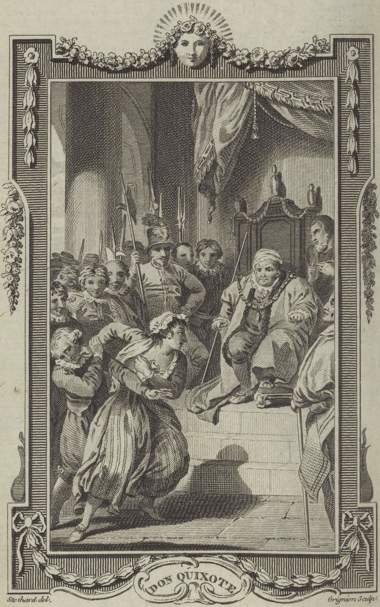 Sancho Panza, as governor and judge of Barataria Island, rules that the twenty ducados be given back to the herder accused by a woman of having raped her. Unsigned. Signed by T. Stothard (illustrator) and C. Grignion I (engraver). Plate VI. Part 2, ch. 45.