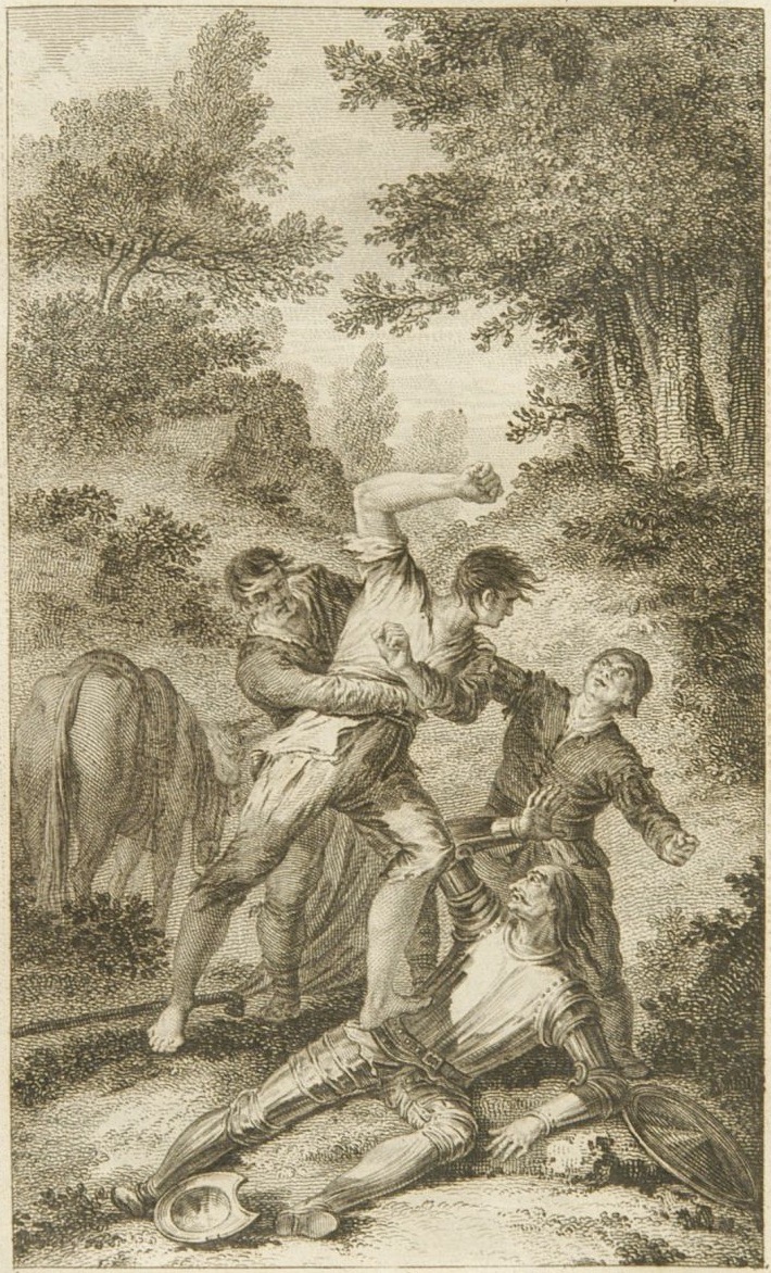 In Sierra Morena, Cardenio attacks Don Quixote and Sancho Panza after the knight interrupts his story. The goatherd tries to stop him, while Rocinante grazes nearby. Signed by J. Rivelles (illustrator) and T. L. Enguídanos (engraver). Part 1, ch. 24.
