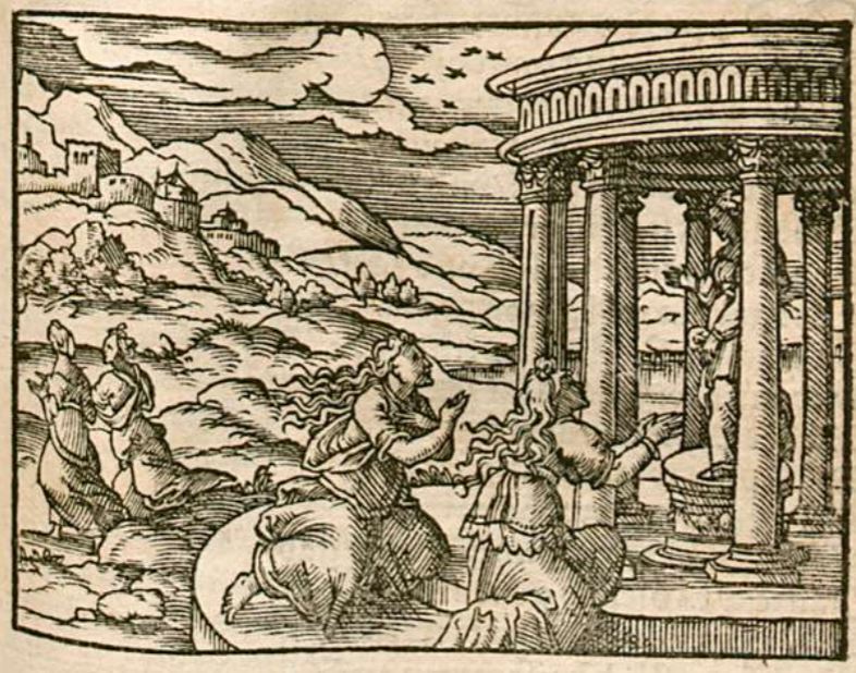 This engraving illustrates Telethusa and her daughter, Iphis, kneeling on the steps of an altar, praying to the Egyptian deity, Isis. Before Iphis was born, her father vowed to kill the child if she were to be born a girl. Isis had appeared to Telethusa in a dream and told her to keep the child no matter what. With the help of Isis, Iphis was disguised as a boy after being born to evade death. This engraving takes place when Iphis is set to marry a woman who is unaware that Iphis is a female. Telethusa and her daughter are praying to the goddess Isis once again for her help. Isis answers the prayers of the mother and daughter and she transforms Iphis into a man, so that she may marry her betrothed.