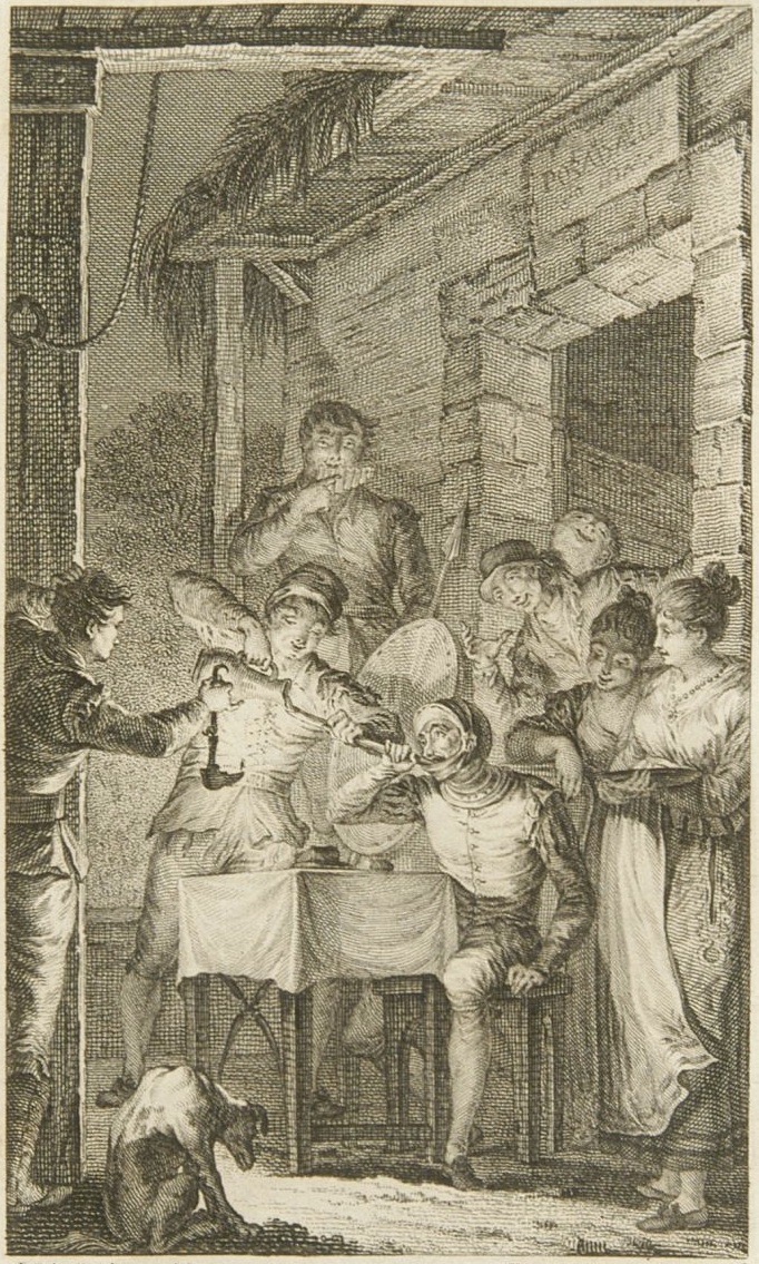 Don Quixote dines at the inn with the innkeeper, Doña Molinera, and Doña Tolosa. They are seated at a table at the door of the inn to take advantage of the cooler air. The innkeeper helps Don Quixote drink wine with a hollow reed through his helmet. A swineherd arrives at the inn and plays his reed pipe. The knight mistakes this sound for music played for his entertainment. The details of the illustration are remarkable: the shadows cast by the light of the lamp (left), the dog, and the architecture. Signed by J. Rivelles (illustrator) and T. L. Enguídanos (engraver). Part 1, ch. 2.