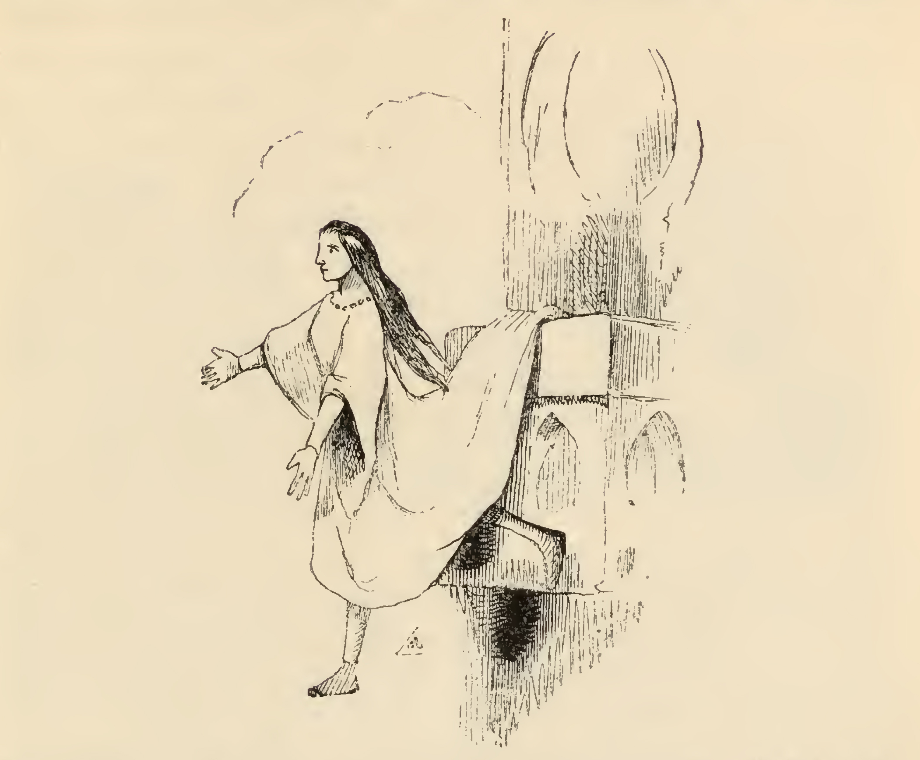 During master Peter's puppet show, Melisandra's puppet, clad in Algerian garb lets herself down from the balcony, to get on horseback and escape the tower, but the skirt ofher petticoat catches hold on one of the iron rails of the balcony. There the puppet hangs dangling in the air, arms and legs extended stiffly,