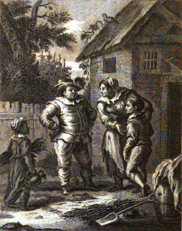 Sancho Panza returns to the village, whose arrival reaches the ears of Teresa Panza, Sancho's wife, and who is disappointed by the riches he has brought back with him, for she was told he was going to be a governor. Hands on his hips, Sancho Panza listens to his wife explain how they needed money to send their son Sanchico (pictured walking towards Sancho on the right) to school, and also for the dowry of their daughter Sanchica (pictured holding sticks in her left arm and an urn in her right.