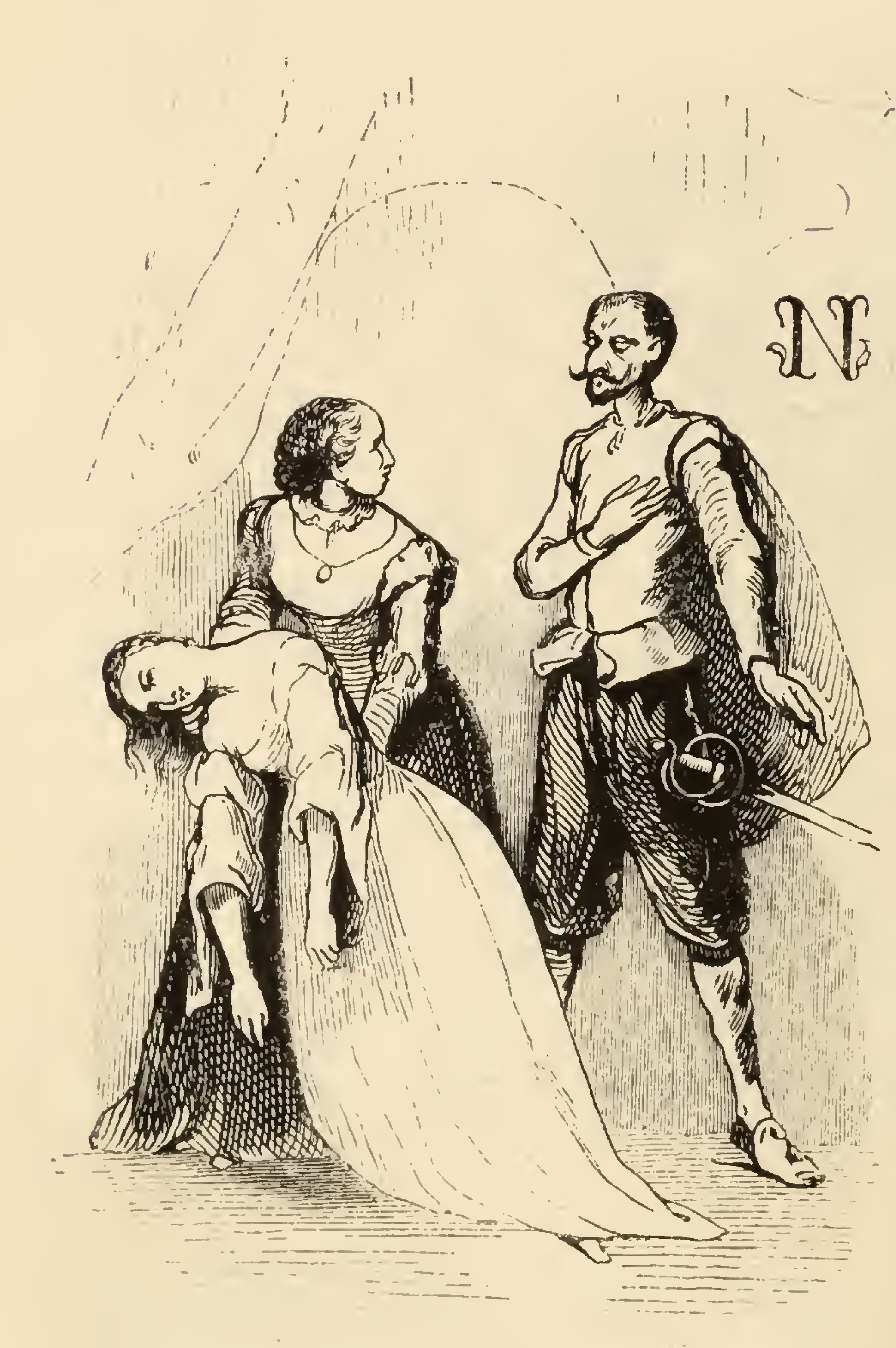 In the estate of the duchess, Don Quixote (right) clad in a doublet with travelling boots and a scarlet mantle with a sword by his waist puts his right arm on his chest to introduce himself to Altisidora, who, upon spying Don Quixote, pretends to faint away, into her companion's arms.