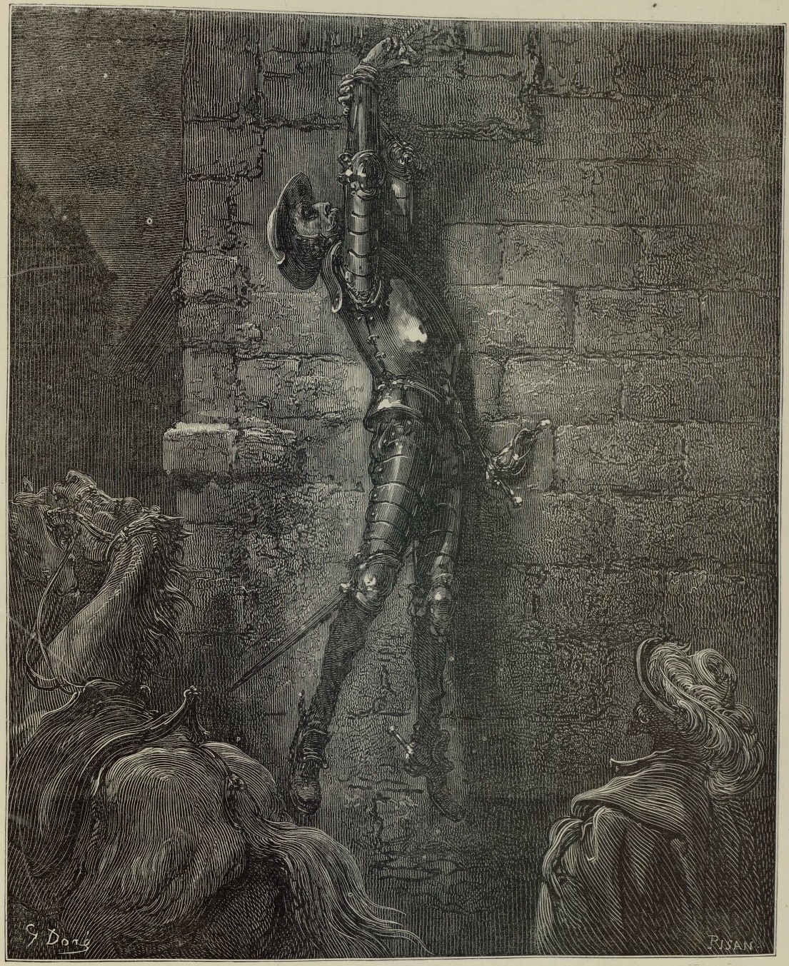 As four travellers (only one represented) arrive to the inn, Rocinante moves toward one of the mares, leaving Don Quixote hanging from the window by his hand. Signed by G. Doré (illustrator) and H.-J. Pisan (engraver). Part 1, ch. 43.