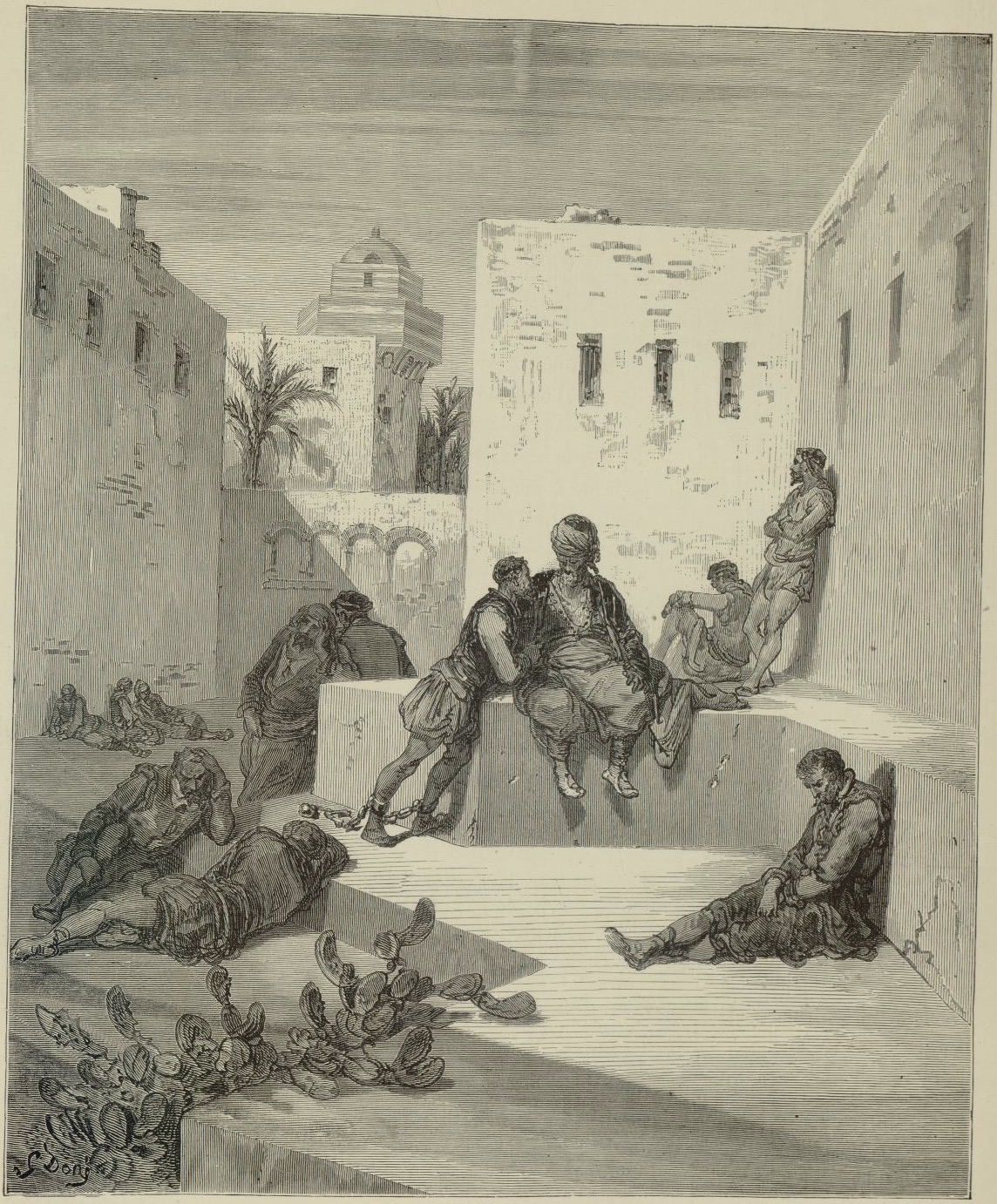 The illustration represents part of the captive’s tale: the captive asks a renegade, a native from Murcia, to translate Zoraida’s letter. He unfolds it and spends a long time looking at it, murmuring to himself. Finally, he asks for ink and a pen so that he can translate it word for word. Signed by G. Doré (illustrator) and H.-J. Pisan (engraver). Part 1, ch. 40.