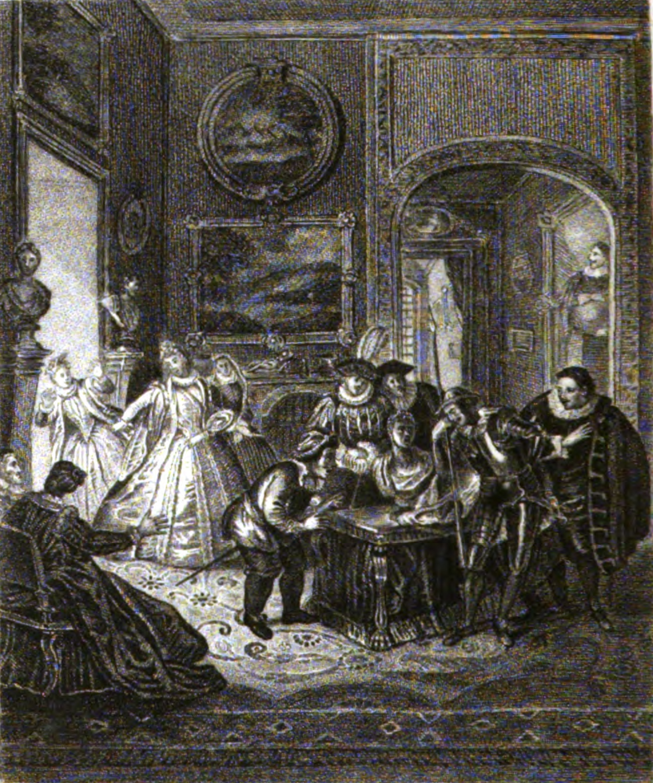 In Don Antonio's home, Don Quixote, Sancho Panza, Don Antonio's wife, two of her friends, two of Don Antonio's friends were led by Don Antonio into a sparsely decorated room with a lone table and a roman styled bust upon the table. Don Antonio talks to the head and it talks back, having been elaborately installed so a person talking from the room above may project their voice to come from within the voice through copper tubing. The head stands upon a table and frame, the legs of which resemble four eagle claws, carved from wood and varnished to look like jasper. The head, which looked like the bust of a roman emperor was of a brass color and hollow on the inside. Quixote, clad in full armor pictured to the right of the bust asks about Dulcinea de Toboso and Sancho Panza, pictured to the left of the bust whispering into its ear asks the head about whether he will ever come to govern his own house once more.
