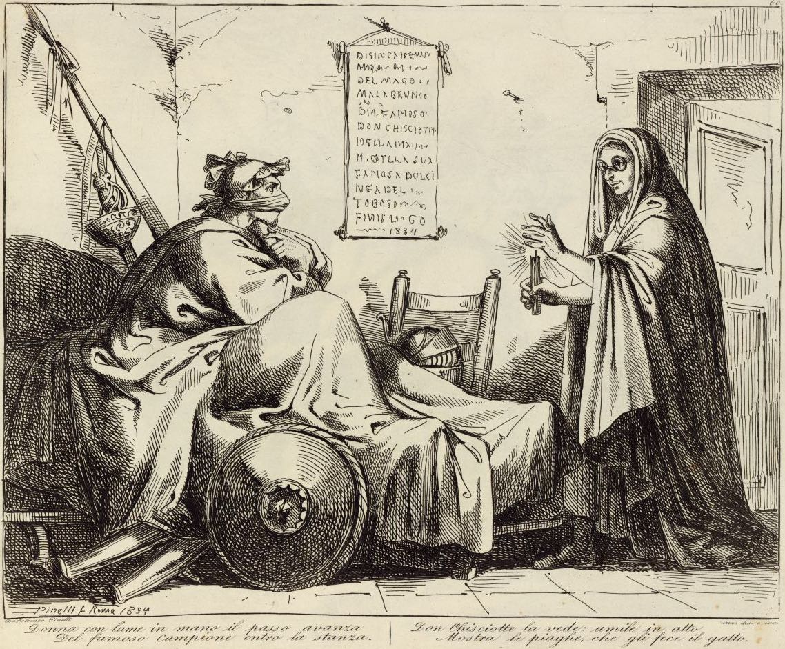 Don Quixote, his face bandaged and marked by the cat’s claws, lies sleepless in bed. Doña Rodríguez, duenna to the duchess, visits him in his room. She holds a candle and wears spectacles. Signed by Bartolomeo Pinelli (engraver and illustrator) and dated Rome, 1833. Plate 60. Part 2, ch. 48.