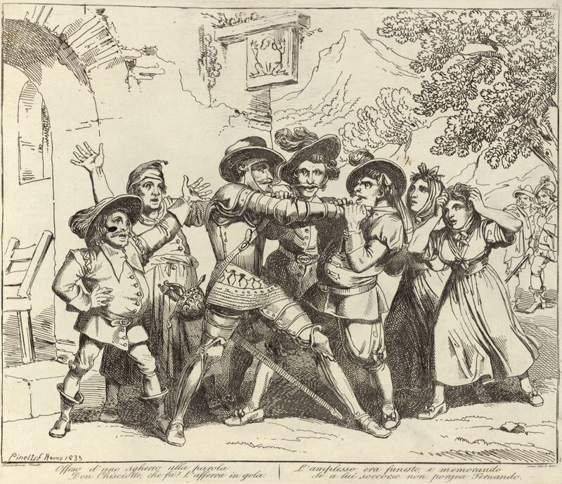 At the inn, a member of the Holy Brotherhood tries to arrest Don Quixote after reading his description. Don Quixote seizes him by the neck while Don Fernando and Sancho Panza rush to stop him. Also pictured are the innkeeper, his wife, and his daughter. Signed by Bartolomeo Pinelli (engraver and illustrator) and dated Rome, 1833. Plate 33. Part 1, ch. 45.