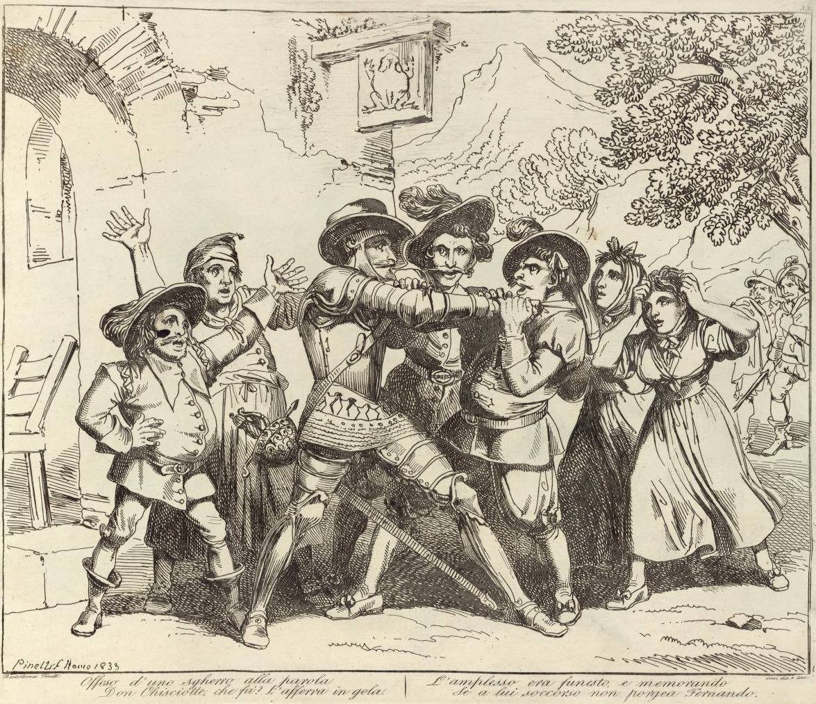 Offeso d'uno sgherro alla parola / Don Chisciotte che fá? L'afferra in gola. / L'amplesso era funesto, e memorando / Se a lui soccorso non porgea Fernando.