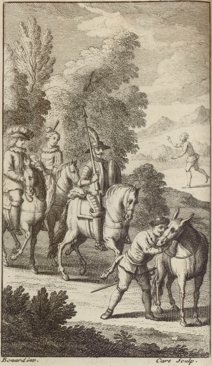 Sancho Panza embraces his donkey after recovering it (foreground). Don Quixote, Dorotea, and Cardenio are depicted mounted on their horses. Ginés de Pasamonte, an ungrateful galley slave that Don Quixote and Sancho Panza freed in ch. 22, flees the scene (background). Signed by Bonard (illustrator), no given name, and L. Cars (engraver). Part 1, ch. 30.
