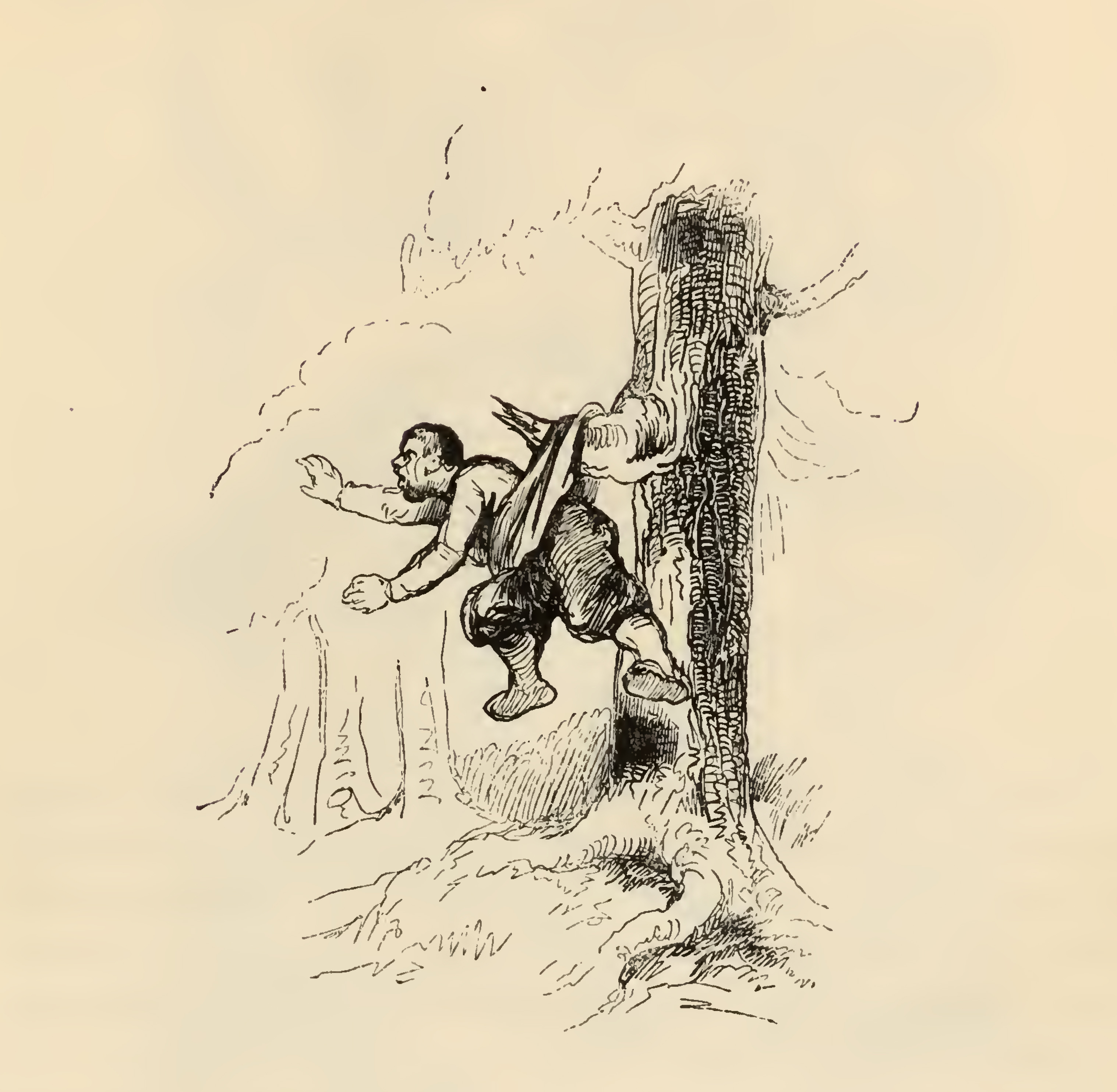 Having endeavoured to climb up into a tall oak, Sancho Panza fell from about half-way up the trunk, and, in tumbling down, he was caught in air by the stump of the branch. Finding himself stuck by this branch, the green coat he was wearing began to tear, and considering that, he began to cry out for help.