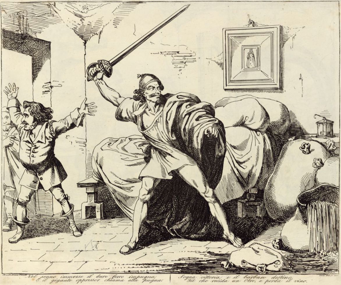 Nel sonno immerso il duro ferro impugna, / E il gigante oppressor chiama alla pugna. / Sogna vittoria, e il barbaro destino / Fà che recida un Otre, e perda il vino.