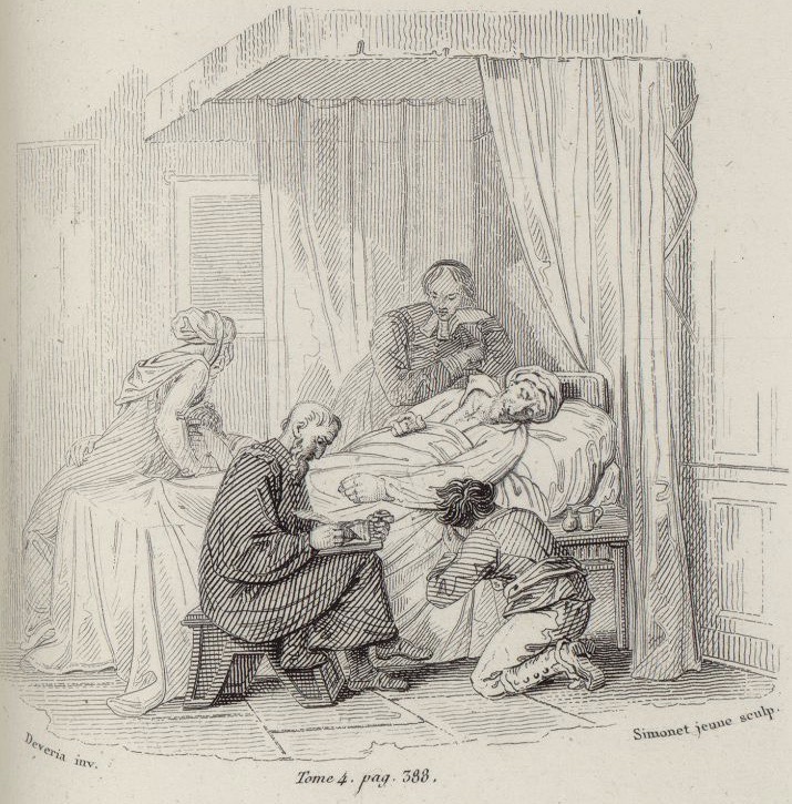 From his bed, Don Quixote dictates his last will to a notary. Also pictured are Sancho Panza (kneeling and weeping), the housekeeper, the priest, and the niece. Signed by A J.-J.-M. Devéria (illustrator) and A. J. Simonet, jeune (engraver). Part 2, ch. 74.