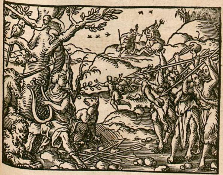 This engraving illustrates the horrific death of Orpheus. Orpheus is illustrated sitting by a tree on the left-hand side of the engraving playing his lyre whilst surrounded by the animals who listen to him. Orpheus is being approached by the Maenads (also known as the Bacchantes), a frenzied group of women who worship the god Bacchus. They first attack the animals that surround Orpheus and tear them to pieces. Then they attacked Orpheus by throwing stones and spears at him until he bled. Just like the animals, the Maenads end up tearing Orpheus to pieces.